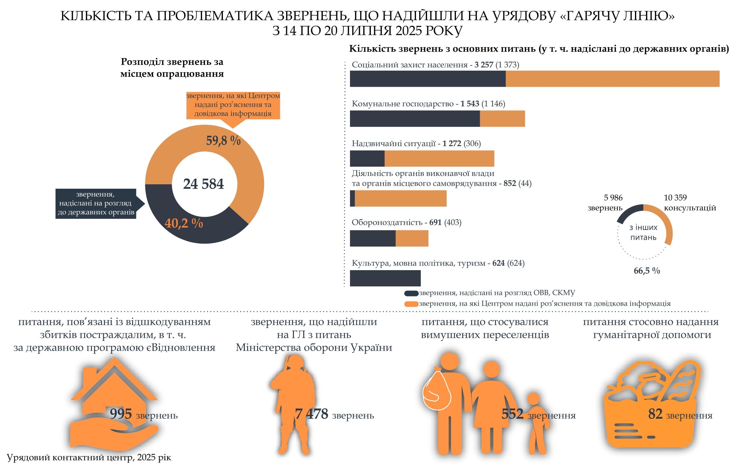 Кількість та проблематика звернень, що надійшли на урядову “гарячу лінію” з 14 липня 2025 року по 20 липня 2025 року.