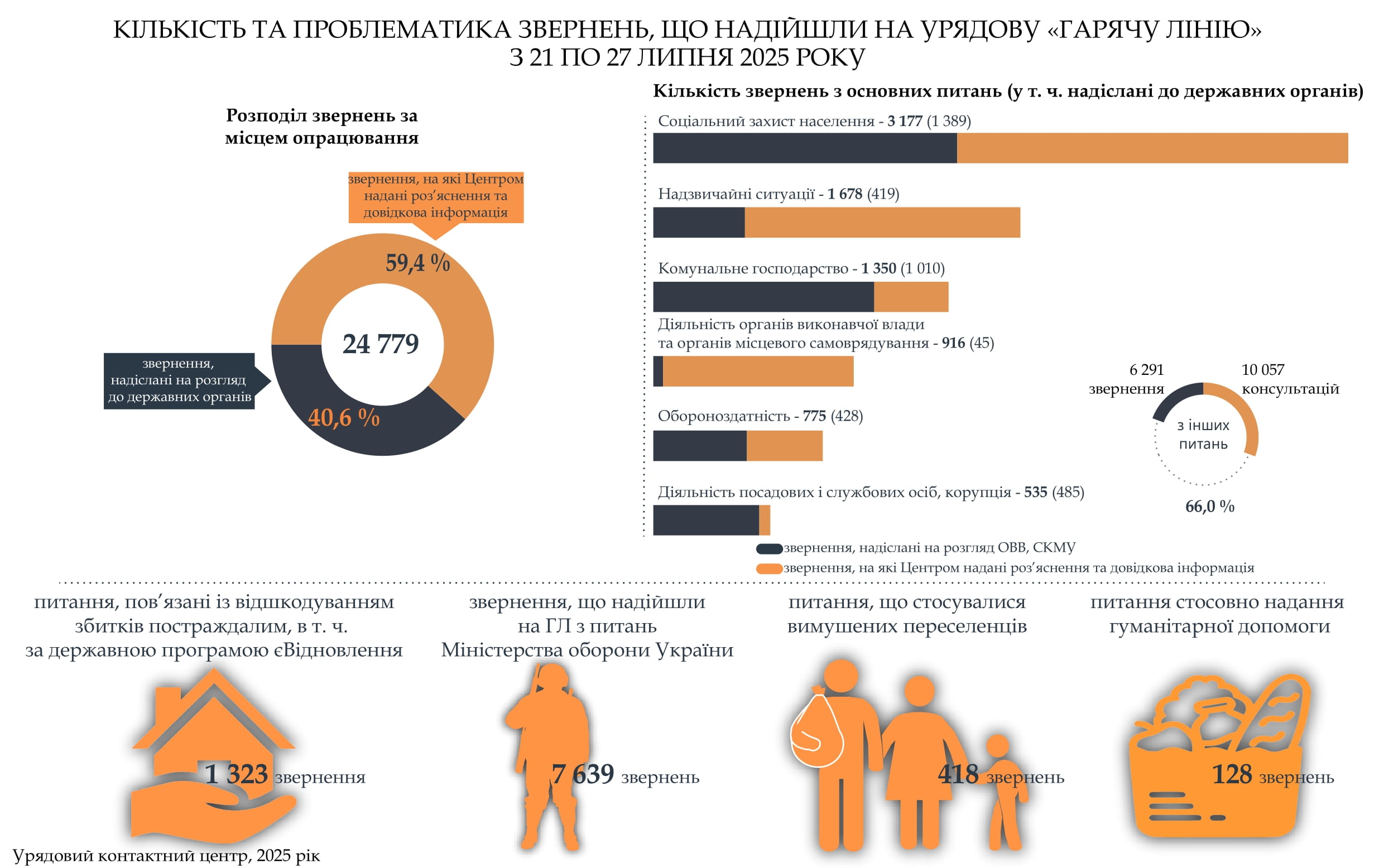 Кількість та проблематика звернень, що надійшли на урядову “гарячу лінію” з 21 липня 2025 року по 27 липня 2025 року.