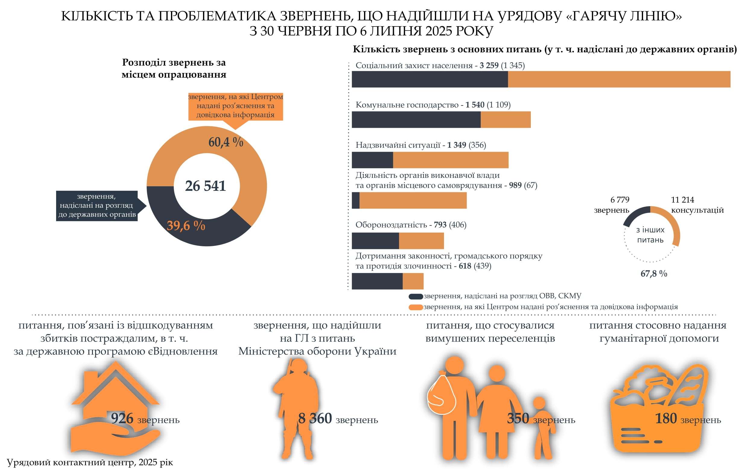 Кількість та проблематика звернень, що надійшли на урядову “гарячу лінію” з 30 червня 2025 року по 6 липня 2025 року.