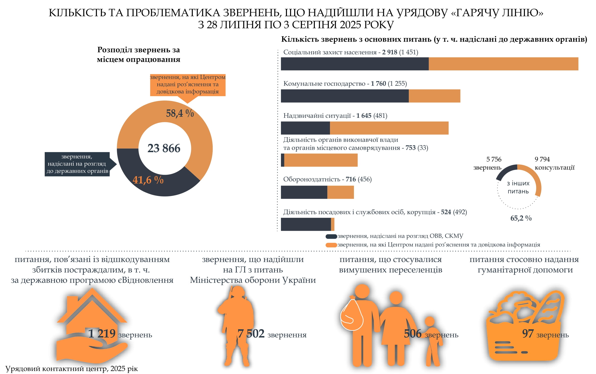 Кількість та проблематика звернень, що надійшли на урядову “гарячу лінію” з 28 липня 2025 року по 3 серпня 2025 року.