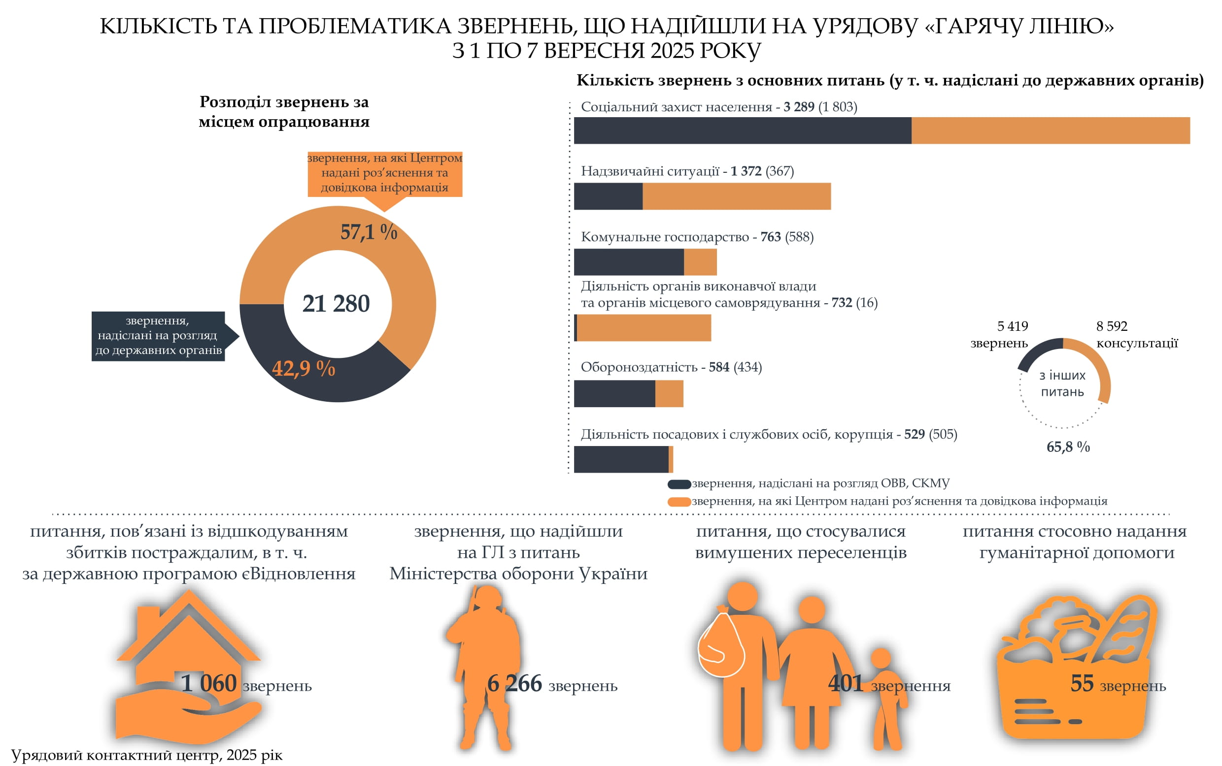 Кількість та проблематика звернень, що надійшли на урядову “гарячу лінію” з 1 вересня 2025 року по 7 вересня 2025 року.