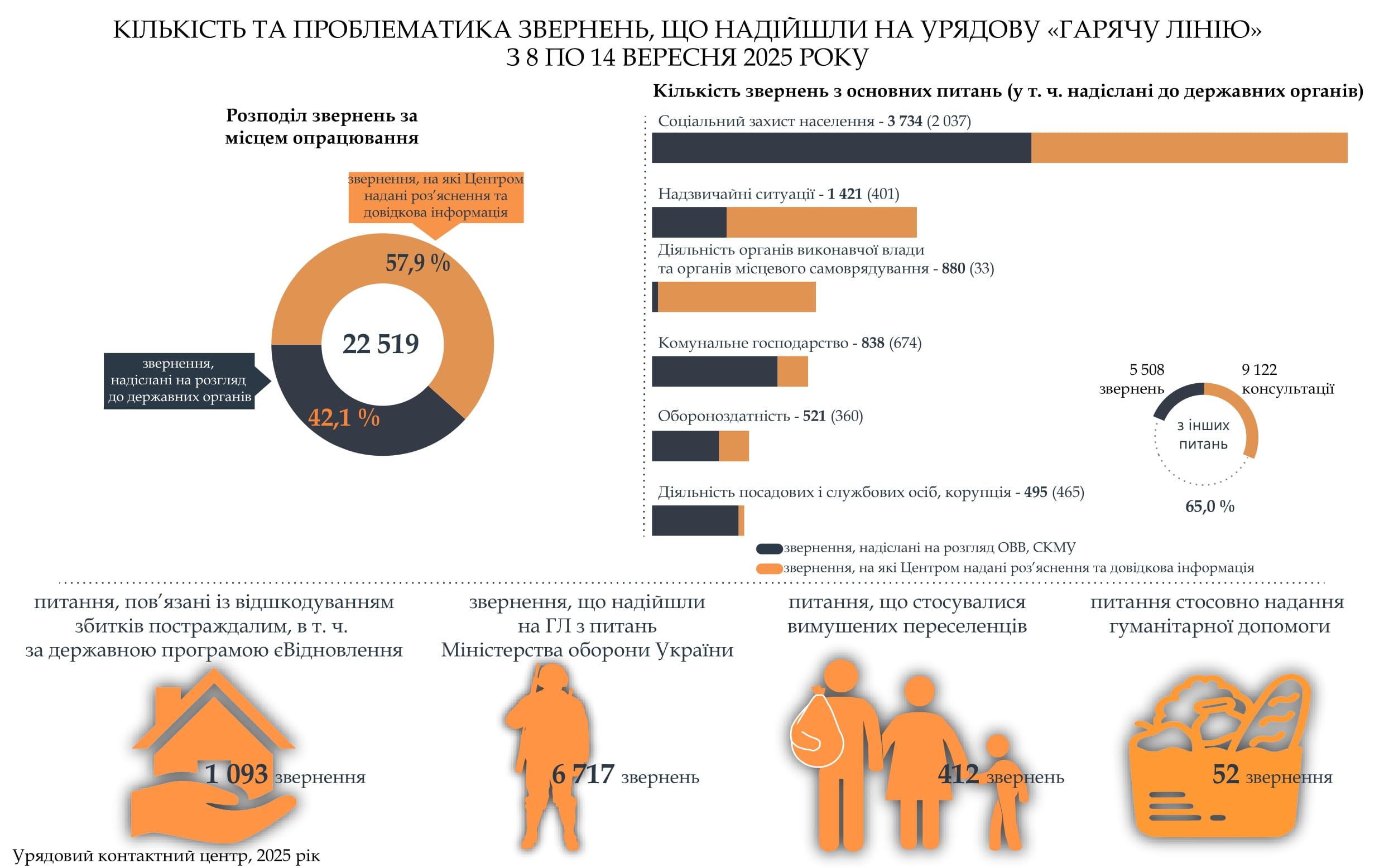 Кількість та проблематика звернень, що надійшли на урядову “гарячу лінію” з 8 вересня 2025 року по 14 вересня 2025 року.