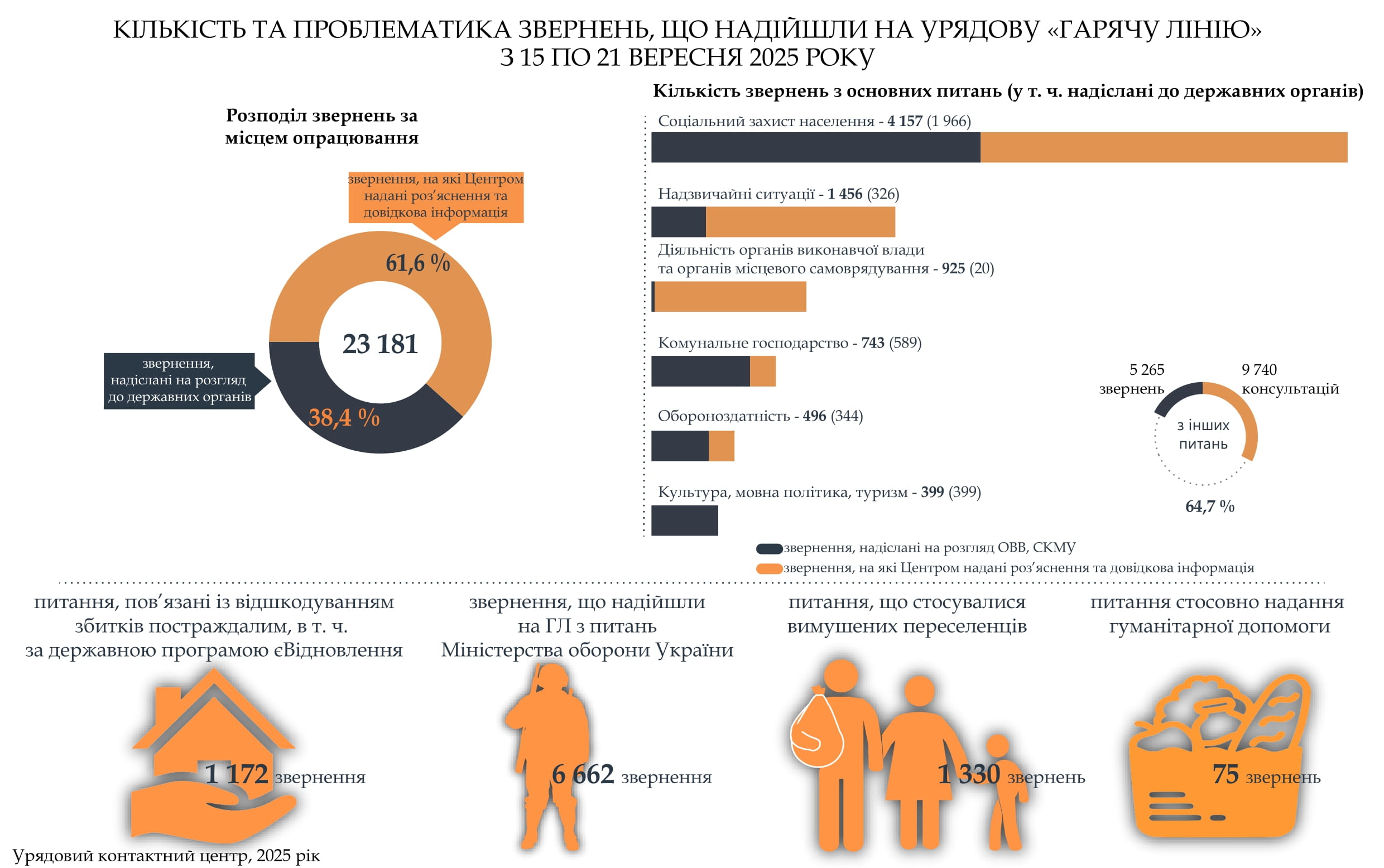 Кількість та проблематика звернень, що надійшли на урядову “гарячу лінію” з 15 вересня 2025 року по 21 вересня 2025 року.