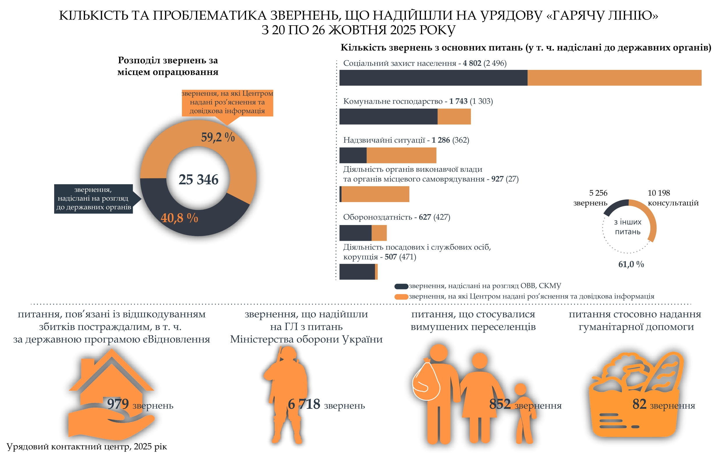 Кількість та проблематика звернень, що надійшли на урядову “гарячу лінію” з 20 жовтня 2025 року по 26 жовтня 2025 року.