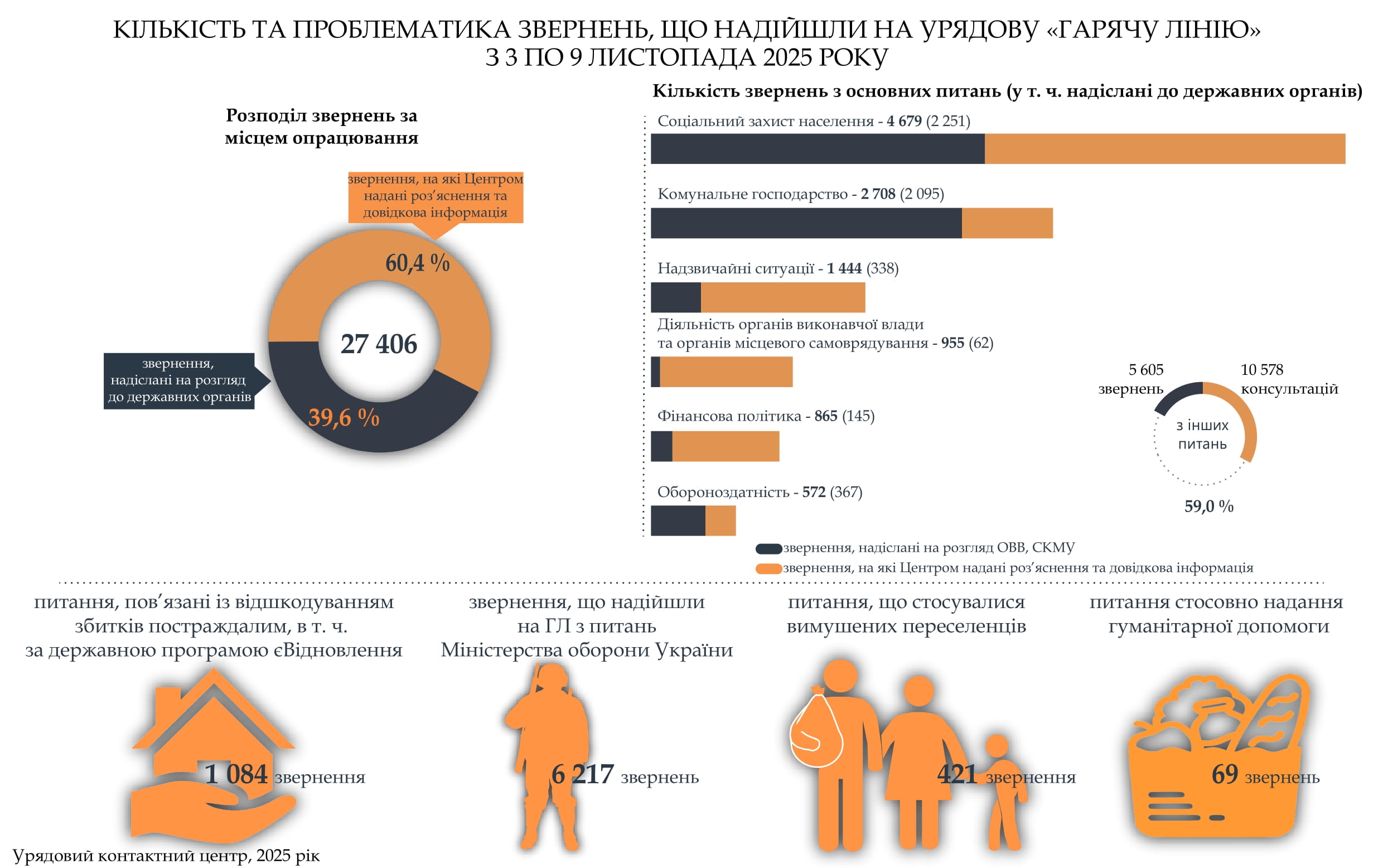 Кількість та проблематика звернень, що надійшли на урядову “гарячу лінію” з 03 листопада 2025 року по 09 листопада 2025 року.