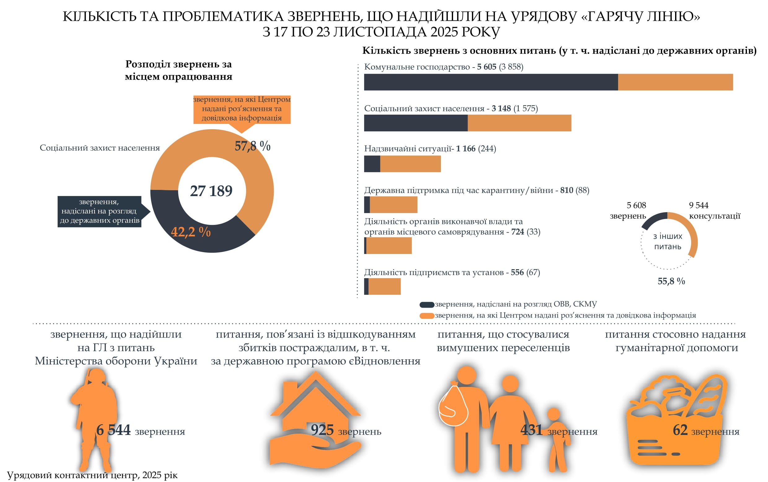 Кількість та проблематика звернень, що надійшли на урядову “гарячу лінію” з 17 листопада 2025 року по 23 листопада 2025 року.