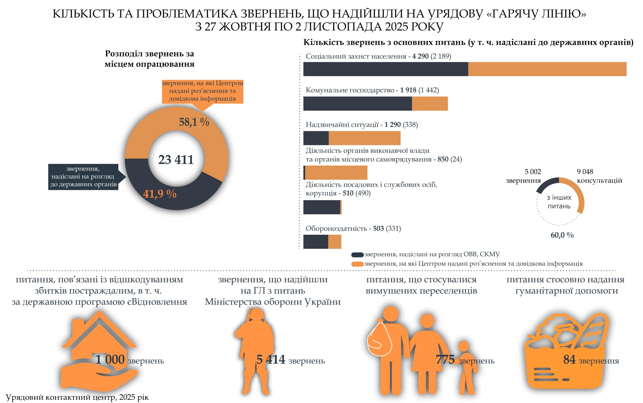 Кількість та проблематика звернень, що надійшли на урядову “гарячу лінію” з 27 жовтня 2025 року по 2 листопада 2025 року.