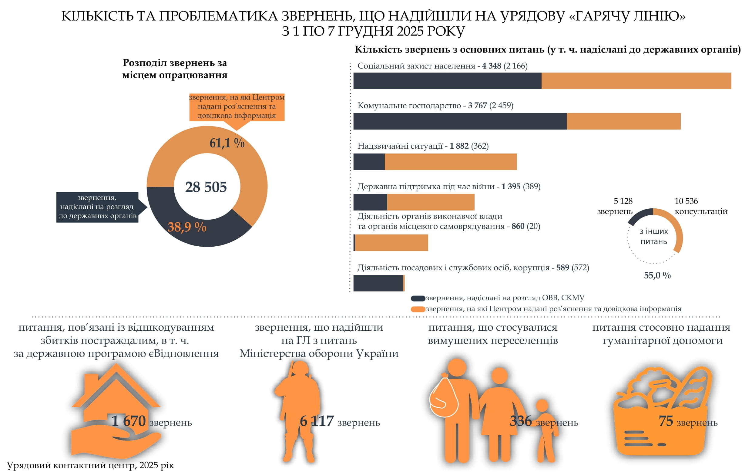 Кількість та проблематика звернень, що надійшли на урядову “гарячу лінію” з 1 грудня 2025 року по 7 грудня 2025 року.