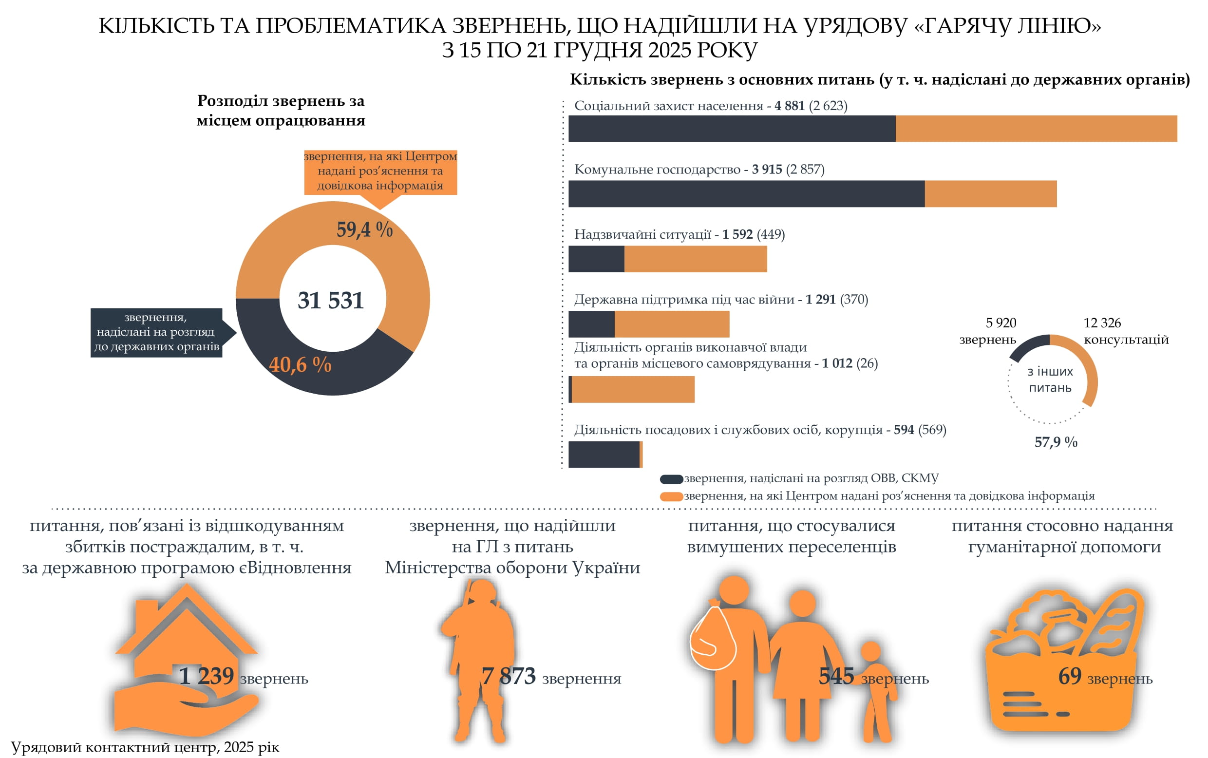 Кількість та проблематика звернень, що надійшли на урядову “гарячу лінію” з 15 грудня 2025 року по 21 грудня 2025 року.