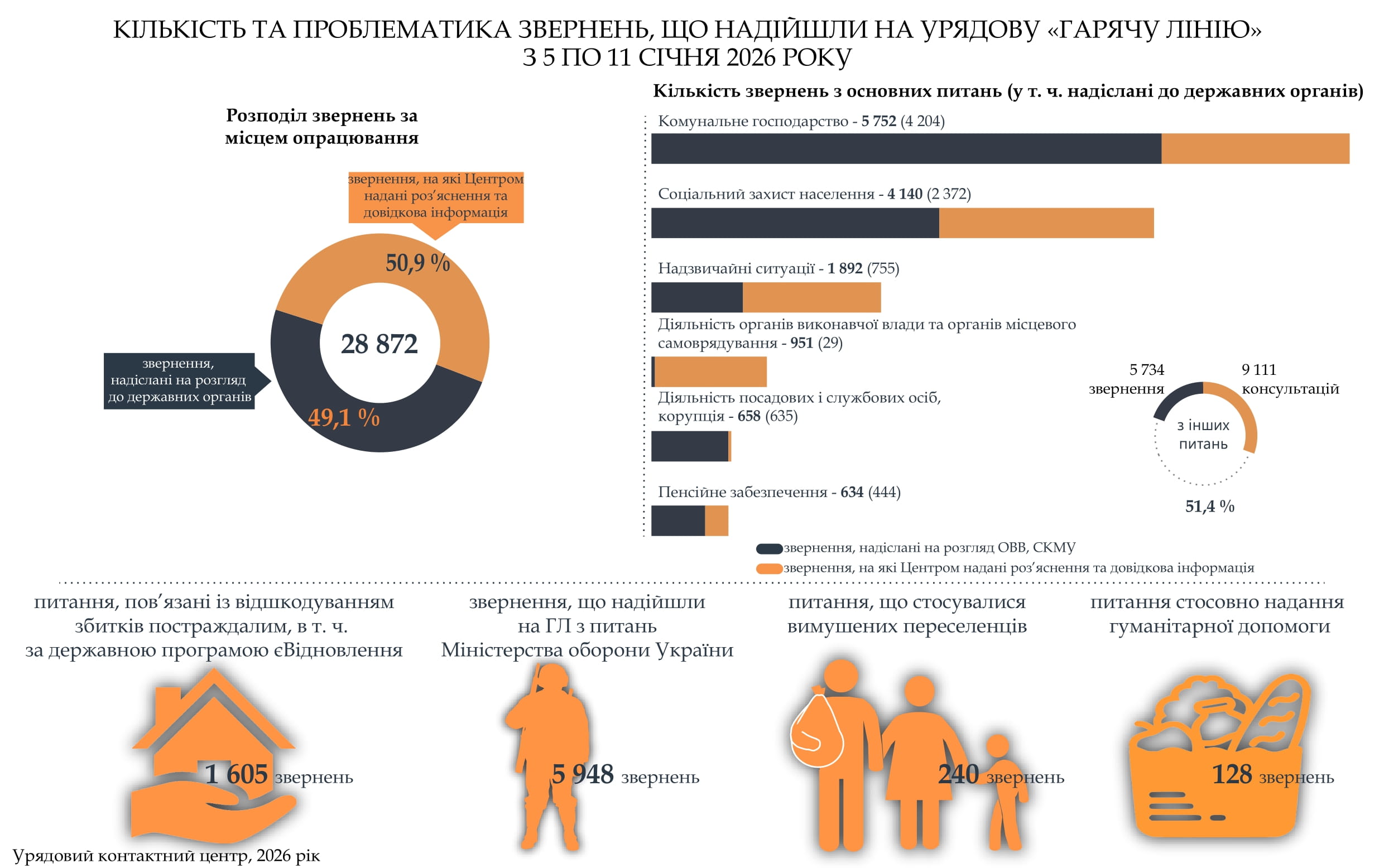 Кількість та проблематика звернень, що надійшли на урядову “гарячу лінію” з 5 січня 2026 року по 11 січня 2026 року.