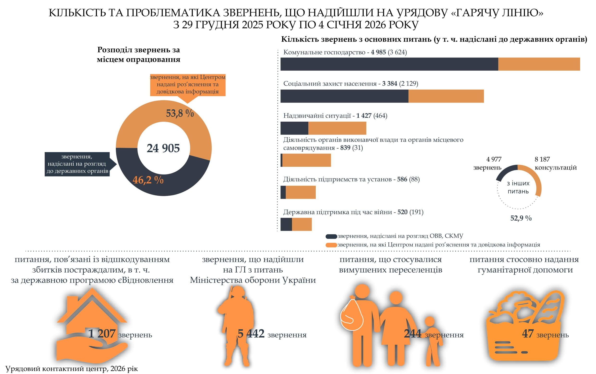 Кількість та проблематика звернень, що надійшли на урядову “гарячу лінію” з 29 грудня 2025 року по 4 січня 2026 року.
